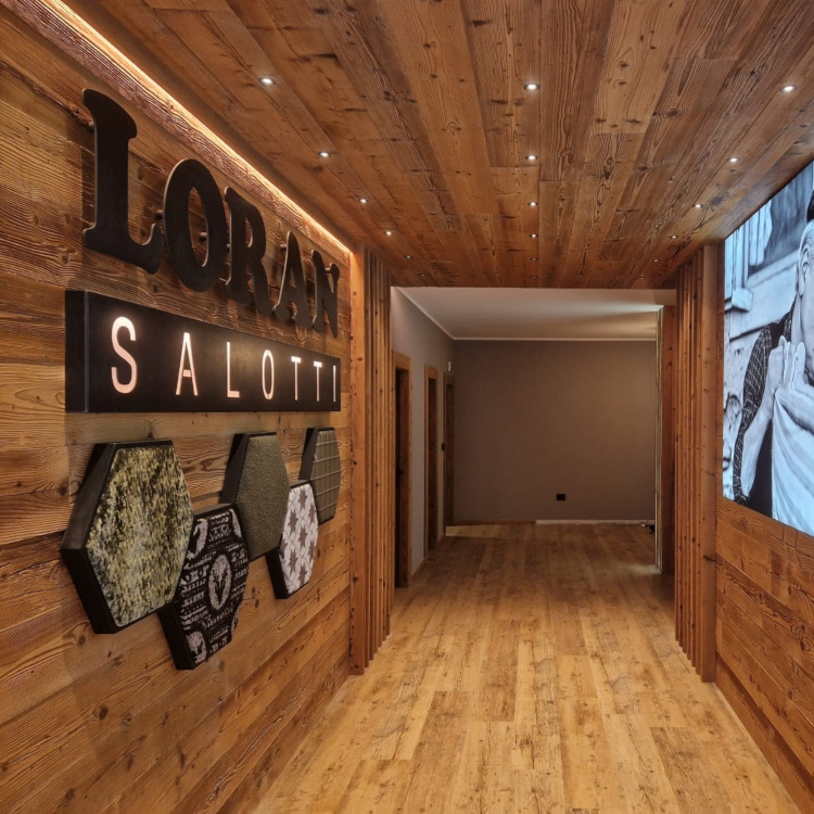 Policarbonato e striscia led sul retro per illuminazione. Fissaggio su rivestimento in legno mediante sottostruttura a scomparsa sia per lettere in rilievo sia per cassonetto inferiore scatolato.